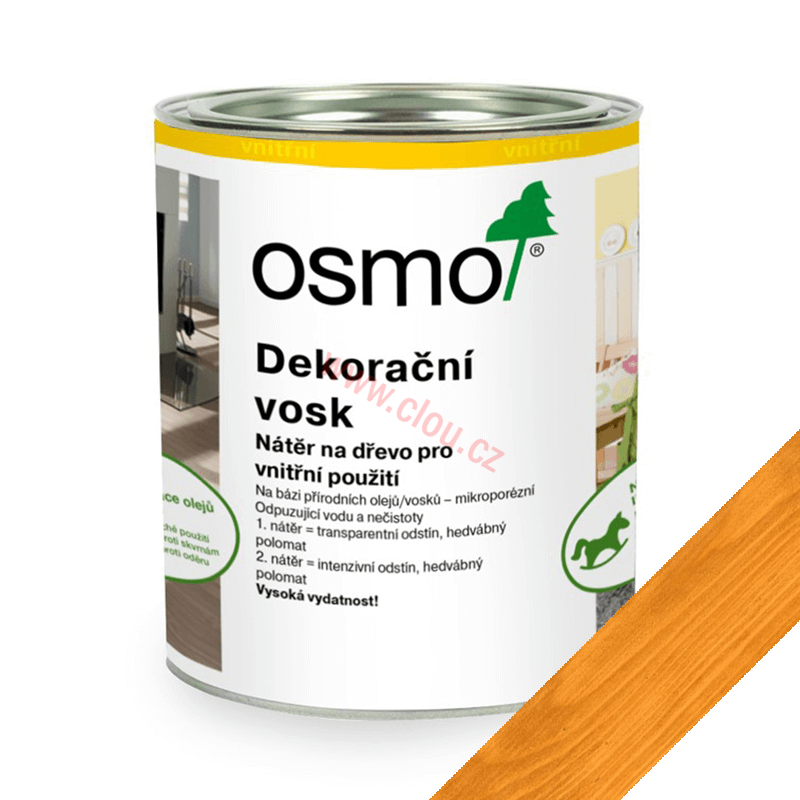 Dekorační vosk je transparentně zbarvený nebo intenzivně zbarvený, je polomatný nebo matný a je určený k použití v interiéru.