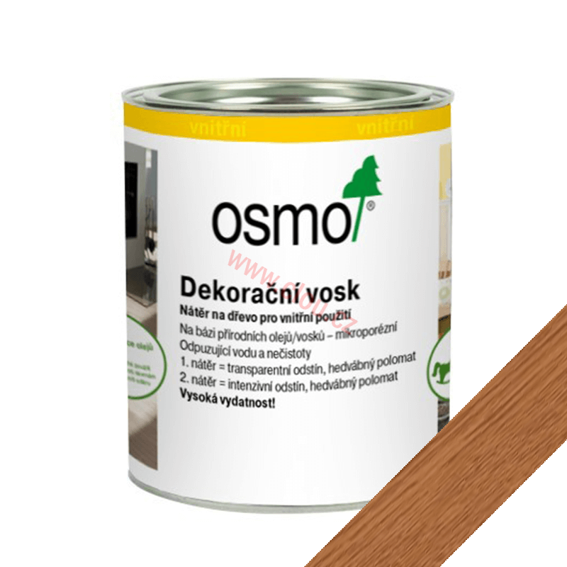 Dekorační vosk je transparentně zbarvený nebo intenzivně zbarvený, je polomatný nebo matný a je určený k použití v interiéru.