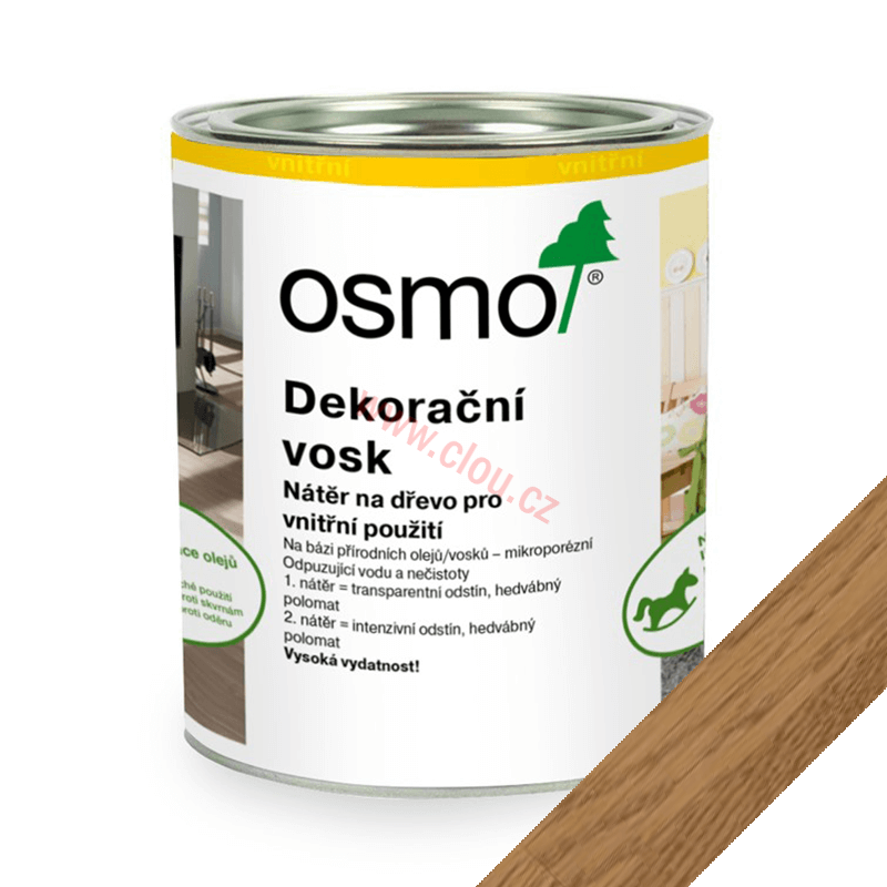 Dekorační vosk je transparentně zbarvený nebo intenzivně zbarvený, je polomatný nebo matný a je určený k použití v interiéru.