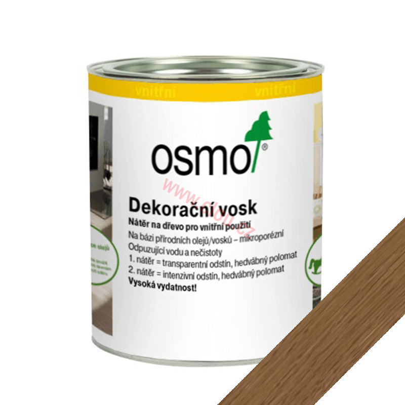 Dekorační vosk je transparentně zbarvený nebo intenzivně zbarvený, je polomatný nebo matný a je určený k použití v interiéru.